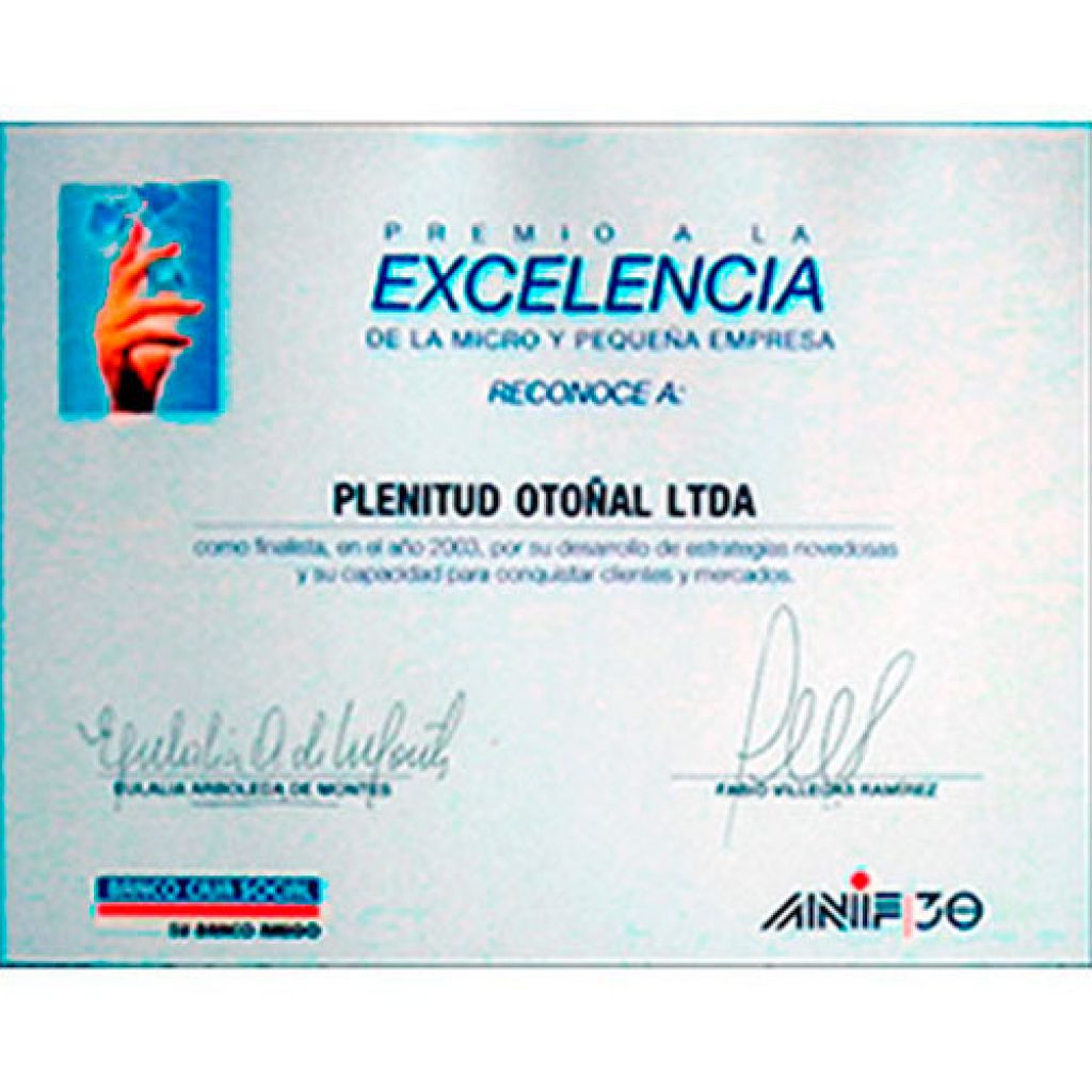 Premio a la Excelencia Empresarial otorgado la Asociación Nacional de Instituciones Financieras – ANIF – Y el Banco Caja Social en el año 2003.